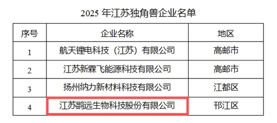 9月24日,江苏省新质生产力促进中心发布2025年江苏独角兽企业和瞪羚企业评估结果。凭借在技术创新、发展前景和成长速度等方面的突出表现,鹍远生物荣幸入选江苏独角兽企业。
